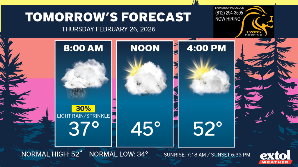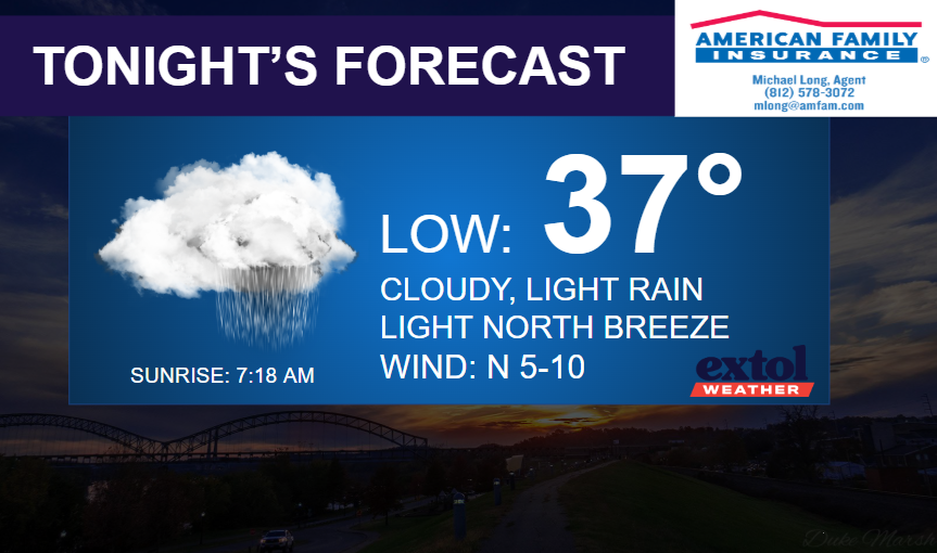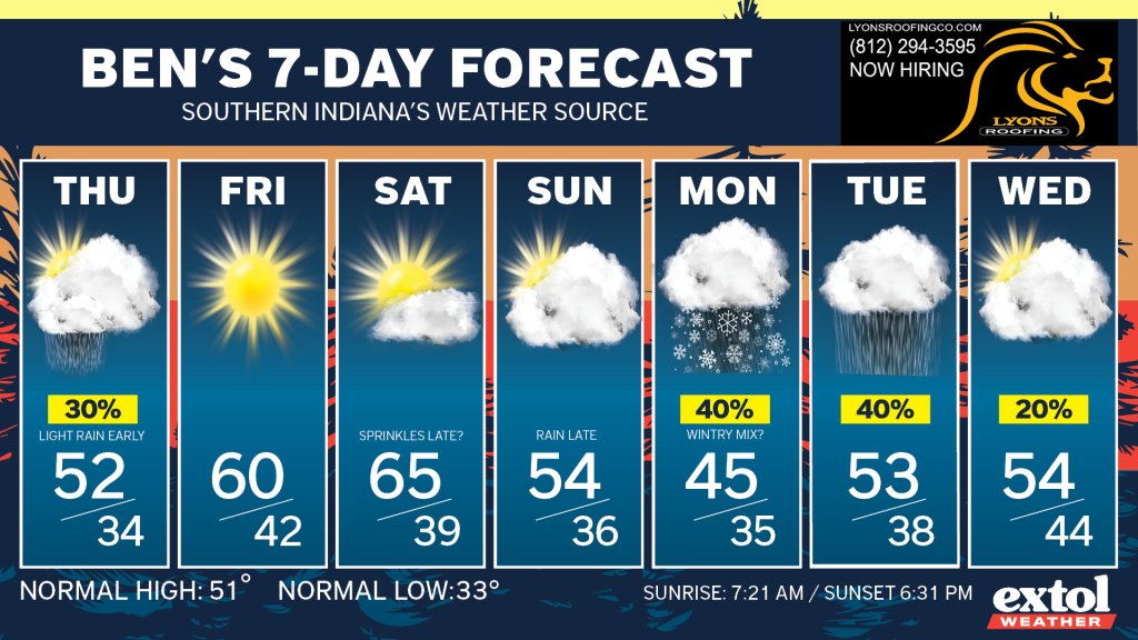 We can expect milder temperatures today with highs in the mid-upper 50s. Partly to mostly cloudy with a southwest breeze at 10-15 mph. A little light rain will develop tonight into early Thursday morning, but much of our Thursday will be dry.