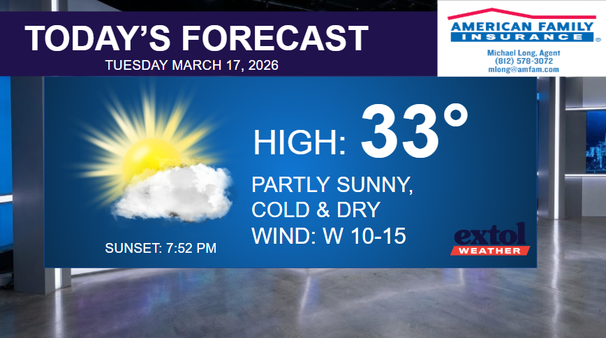 It’s simply going to be a cold St. Patrick’s Day with highs only in the low-mid 30s, about 25-degrees below normal. Partly sunny with a lighter wind from the west at 10-15 mph.