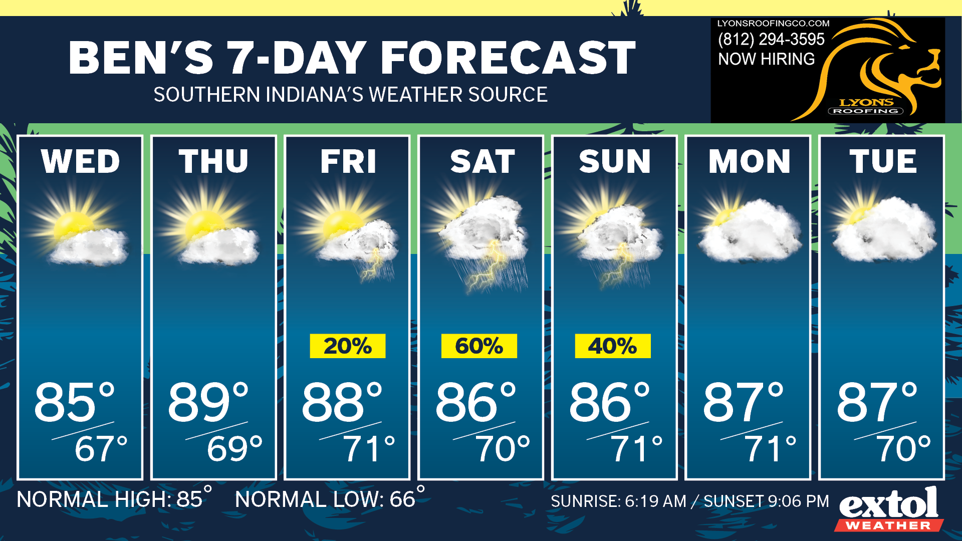 Temperatures will be warming up through the workweek with mid-80s Wednesday, then upper 80s Thursday and Friday. The humidity levels will slowly be creeping up as well, peaking this weekend with muggy conditions.