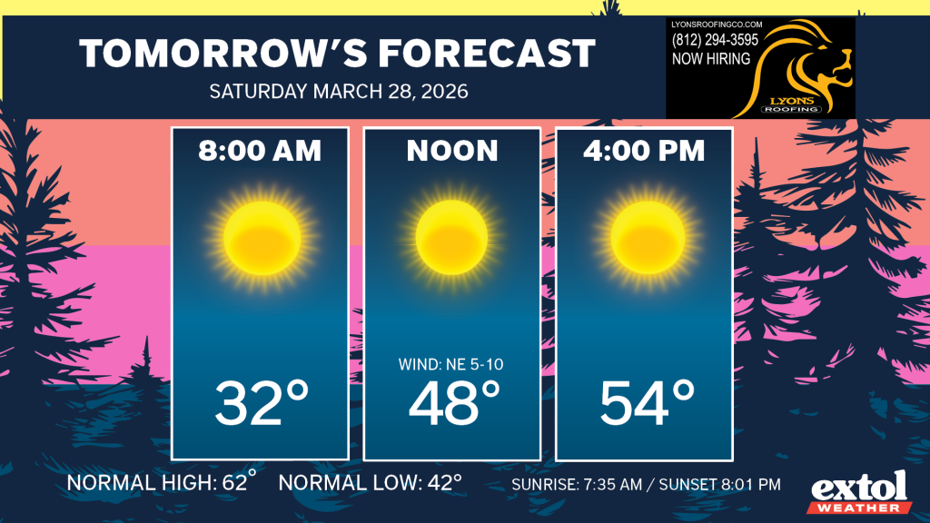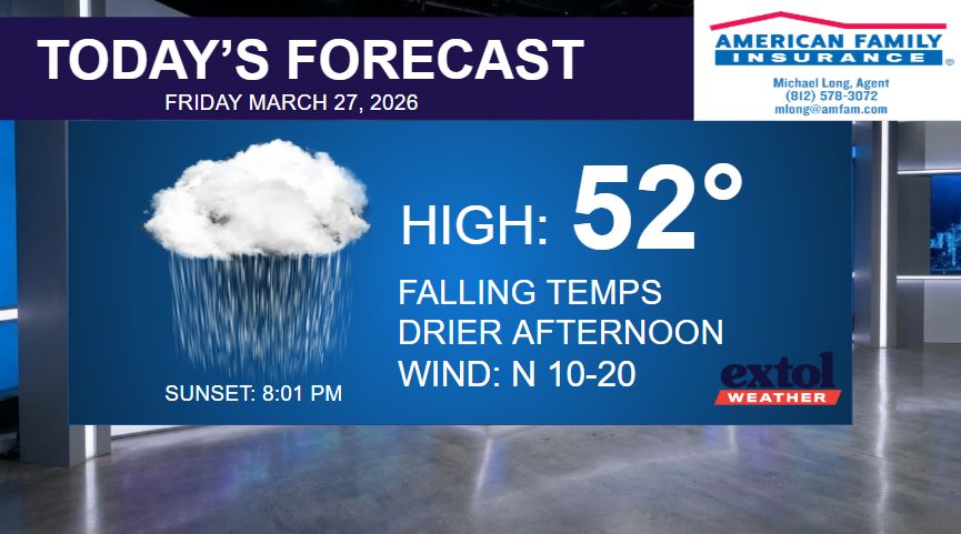 The cold front responsible for this morning’s rain will move south and gradually take the rain with it this afternoon. Cooler temperatures are here with upper 40s and low 50s this afternoon. A north wind at 10-20 mph.