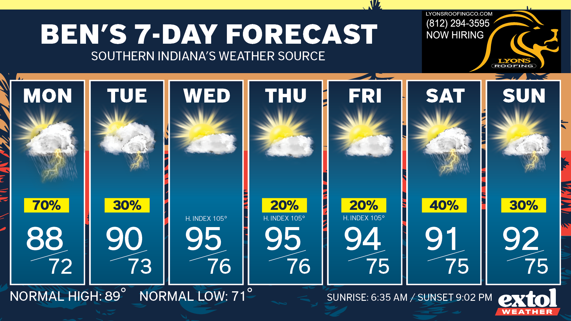 Now, after this stormy period of weather, we’re looking at hotter and drier conditions mid-week. We could end up with heat index values well over 100° Wednesday through Friday. Storm chances may increase again as we head into next weekend. Stay safe!