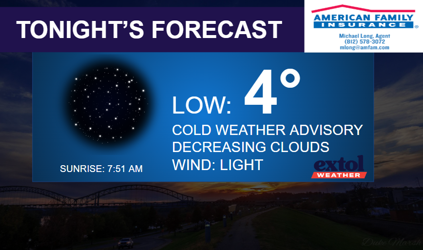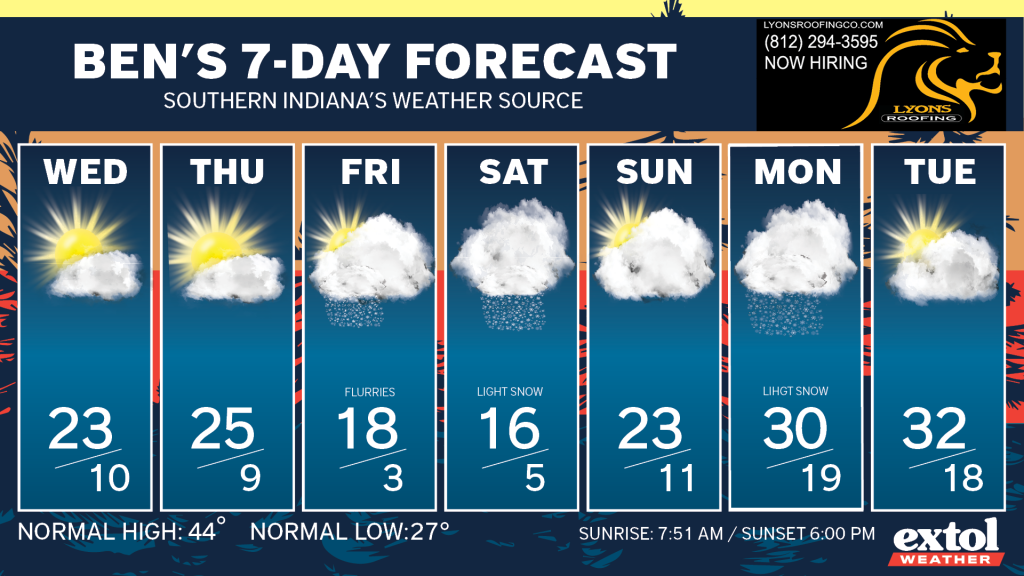 We’re still only in the early stages of this long-lasting polar pattern. For today, expect highs in the low to mid-20s. Breezy too, with southwest winds at 10-25 mph. A few flurries possible, especially for areas to the northeast around Madison, Indiana to Lexington, Kentucky later this afternoon. Stay warm!
