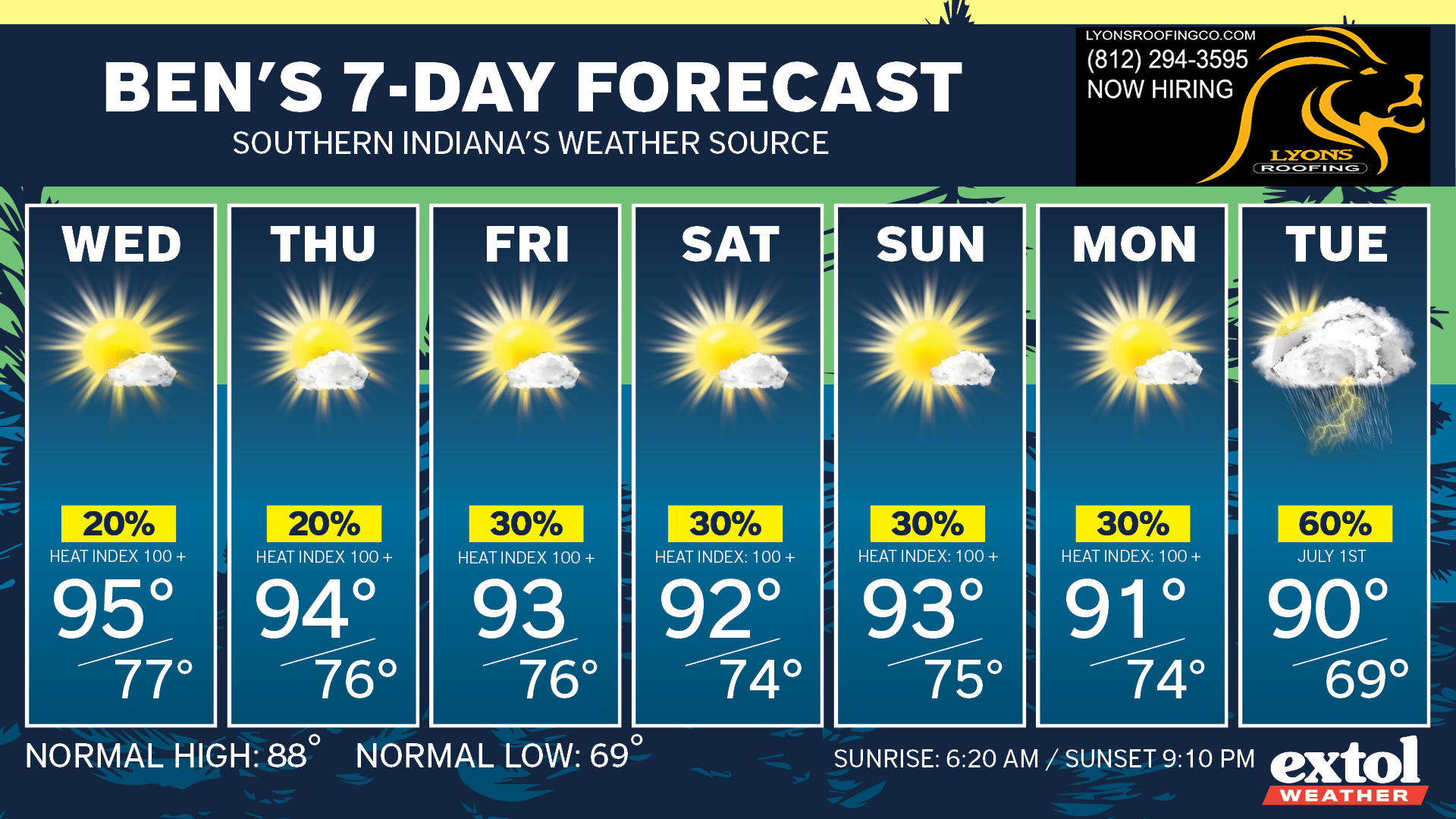 Our late June heat wave will roll on for the rest of this week with highs in the low-mid 90s, and heat index values at 100°+.