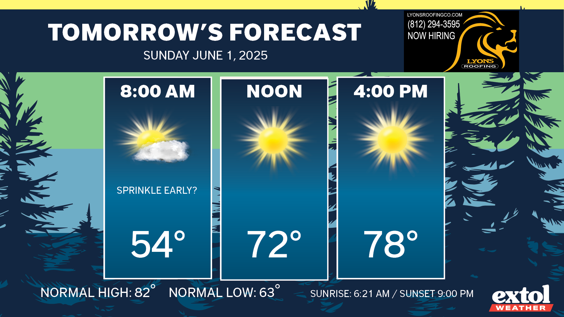 Sunday is June 1st, and it will be quite nice, with sunshine and highs in the upper 70s. Light north breeze at 5-10 mph.