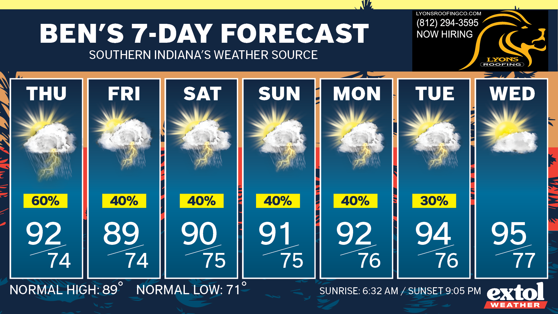 Highs today will be in the lower 90s, feeling like around 100°. Southwest wind at 10-15 mph. The good news, the pollen report remains low. Humid tonight with lows in the 70s.