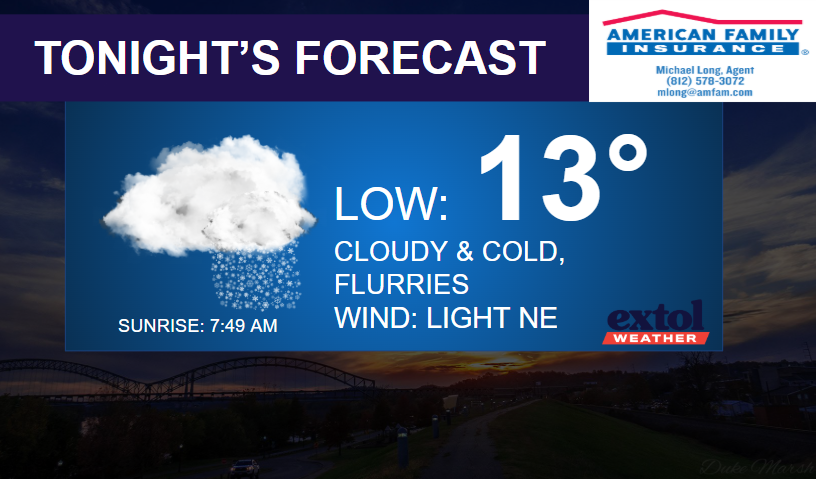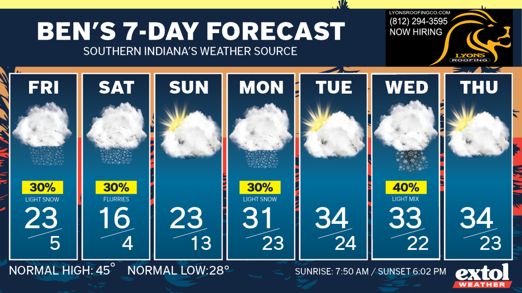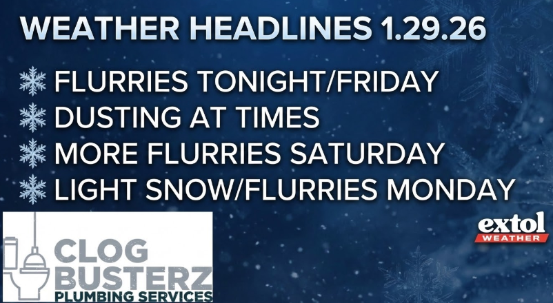Late tonight through Saturday we’ll have little disturbances moving through the upper-levels of the atmosphere helping to produce occasional flurries and light snow showers. This could produce a light coating/dusting at times. Any light amount could cause slick roads.