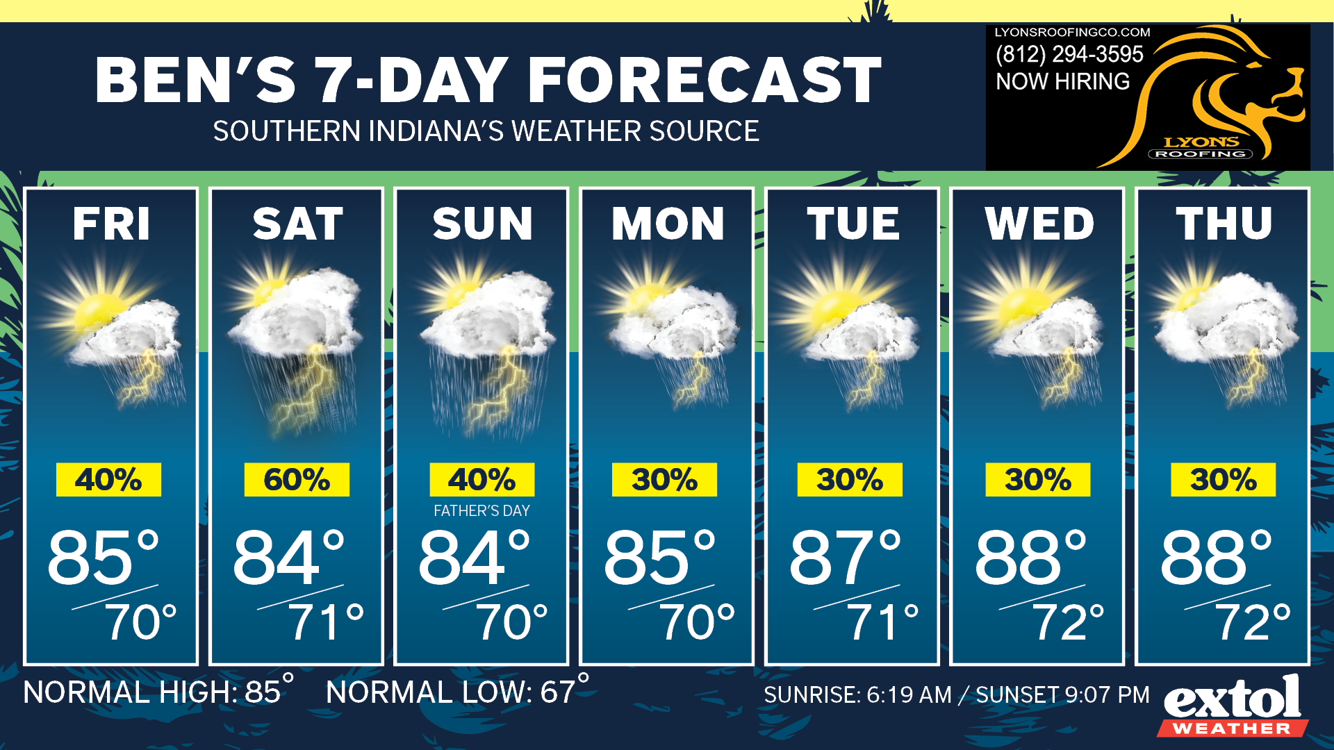 Dew points (measure of water content) are on the rise heading into the weekend, so our atmosphere will have a Florida feel through Father’s Day Weekend.
