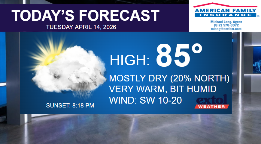 A few showers/storms may pop-up just to our north, closer to Seymour, Indiana later today, but most areas will stay dry.