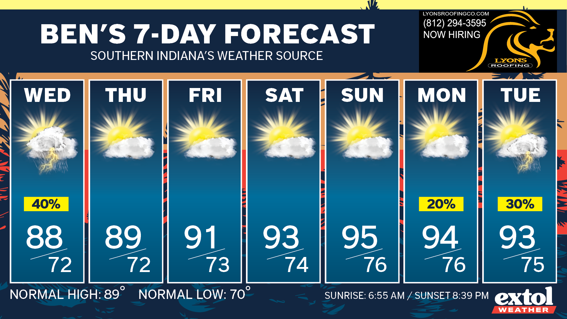 After Wednesday, high pressure begins to build back into the region, giving us mainly dry and hot weather for Thursday and the rest of this week. No significant changes to our hot pattern through the middle of next week. We’re hoping for some big relief perhaps by the following weekend, around the 23/24th of August.