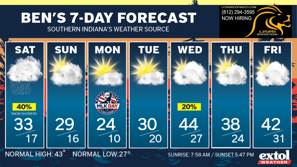 Get ready for a polar period of temperatures! Frigid conditions Sunday through early next week. Highs only in the 20s for MLK Day. So far, next week is looking pretty quiet.