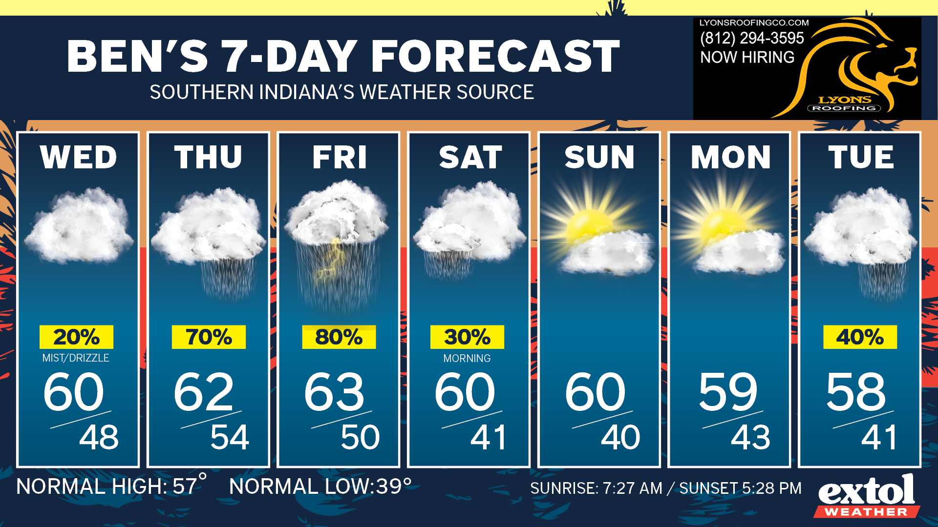 It’s pretty much a washout today, with scattered showers and a few thunderstorms through this evening. The rain will add up to around an inch in many locations. The severe threat will stay low – level 1 out of 5 from the Storm Prediction Center. The small threat of a brief spin-up tornado stays just off to the southwest of Louisville Metro.