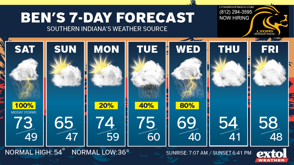 Monday is looking mostly dry, although an isolated shower possible with highs back to the 70s. Spotty showers Tuesday, then our wettest weather will be Wednesday. Cooler and dry next Thursday and Friday.