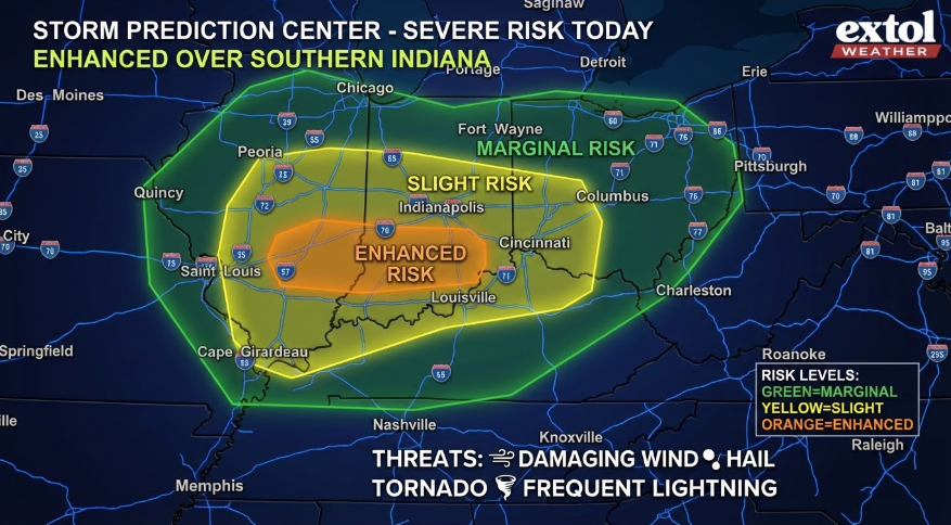 Let’s all be extra weather aware today with the potential of strong to severe storms firing up later this afternoon and into the evening. The highest threat will likely be over parts of Southern Indiana. The Storm Prediction Center has our region under a Slight Risk of Severe Storms today.