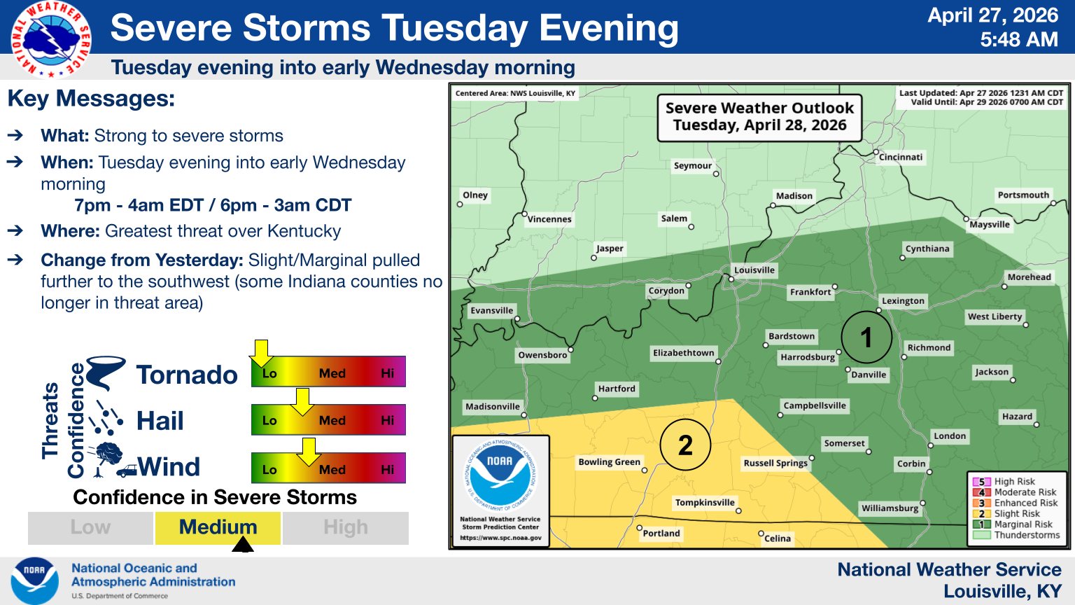 Be prepared for a line of strong to severe storms to move through the region later tonight, especially after 8PM (some areas in Indiana could see storms sooner, especially farther northwest). The strongest storms will likely be west of I-65. You can see the latest briefing slides from our local National Weather Service below.