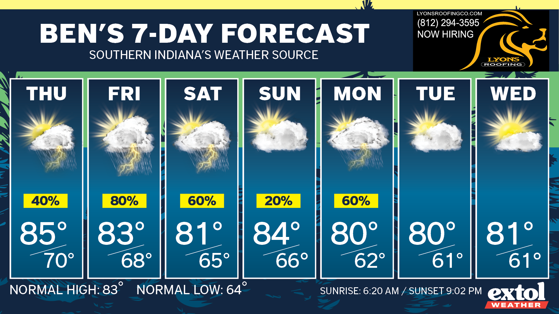 Now, let’s look ahead to our chances of showers and storms Thursday through Saturday. A stationary front will get hung up over Central Indiana Thursday, and it will be close enough for spotty showers and storms over Southern Indiana. It does look like Kentucky will end up drier than Indiana Thursday, as Kentucky will be farther away from the front.