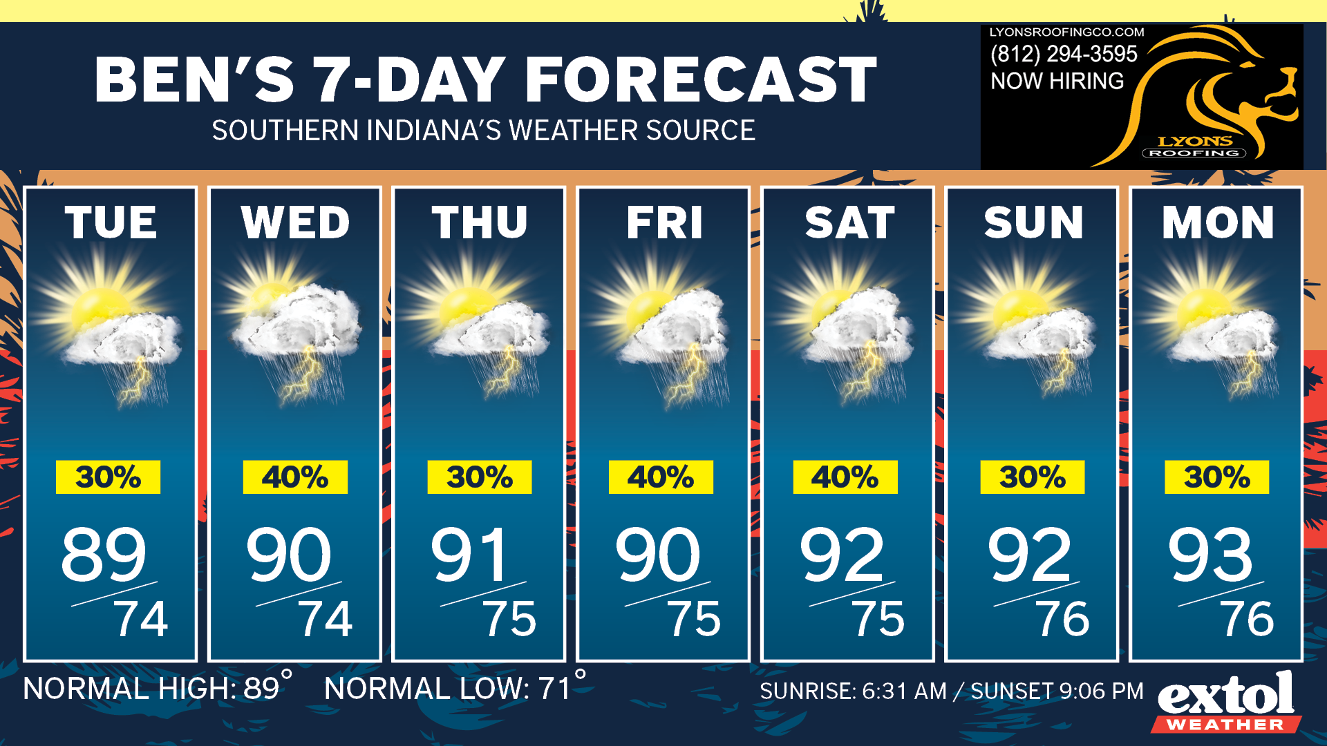 Highs this week will generally stay in the upper 80s and lower 90s. The severe weather threat will remain very low, with mostly garden-variety afternoon pop-up showers and storms.