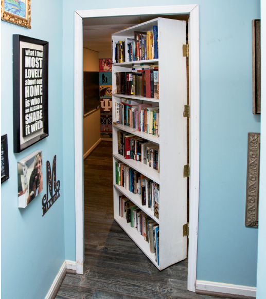 The lower level is full of fun and surprises. A story wall showcases brightly painted canvases highlighting special family moments. The theater room is revealed by a “magical” bookcase that doubles as a secret door where only one book unlatches it.
