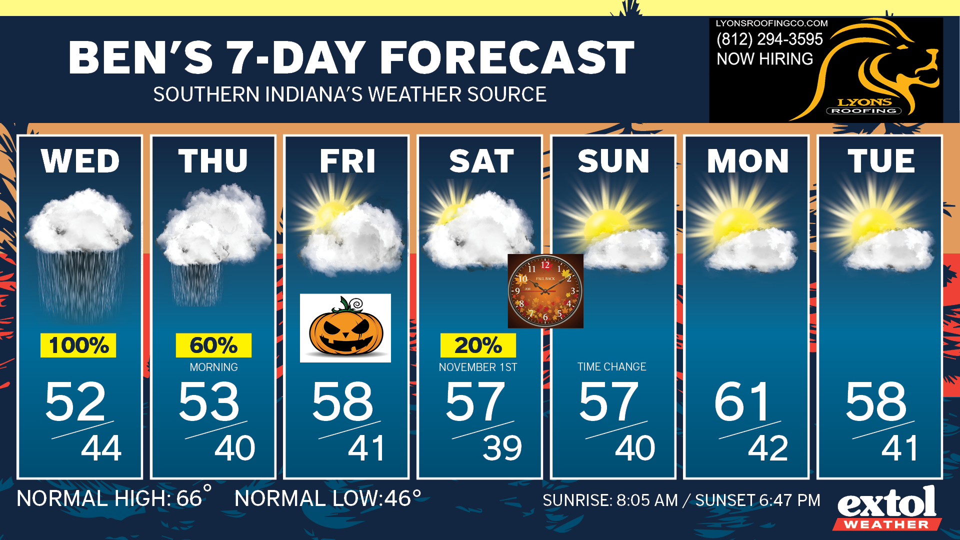 Drying out Thursday afternoon, and staying cool and dry for Halloween. Warm costumes will be good for trick-or-treating with temperatures in the 40s Friday evening. A longer drier pattern begins Friday, with perhaps just an isolated shower or sprinkle Saturday.