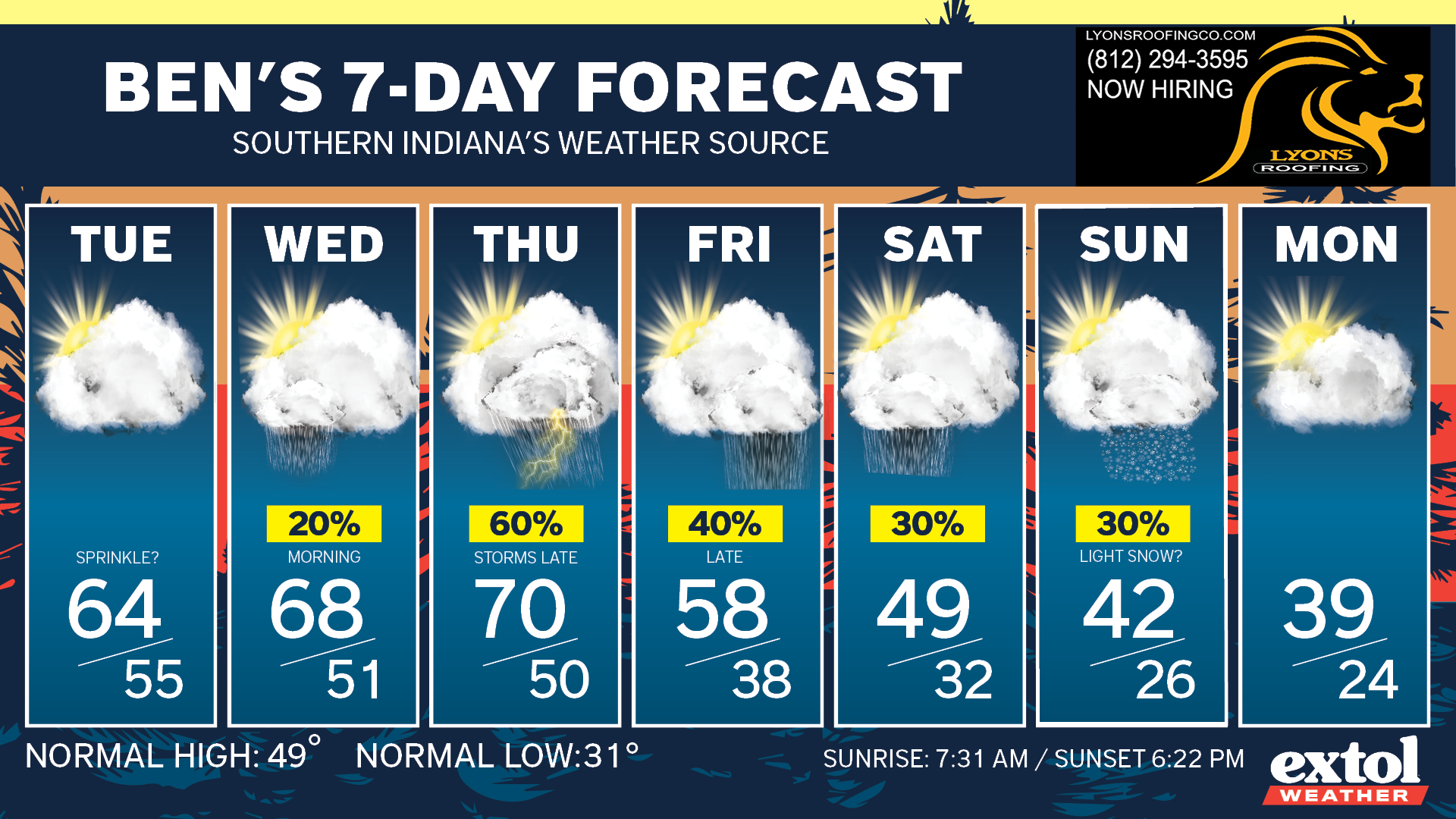 Warmer often means wetter this time of year, so look for some light rain showers early Wednesday. Heavier rain and possibly thunderstorms late Thursday. More rain chances Friday night.