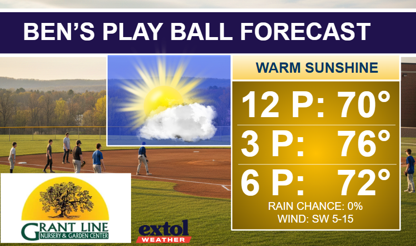 We have a beautiful stretch of weather through this weekend with highs in the 70s through Saturday, then lower 80s Sunday. Our next chance of rain will return with a weak front arriving Friday evening, mainly after 7PM.
