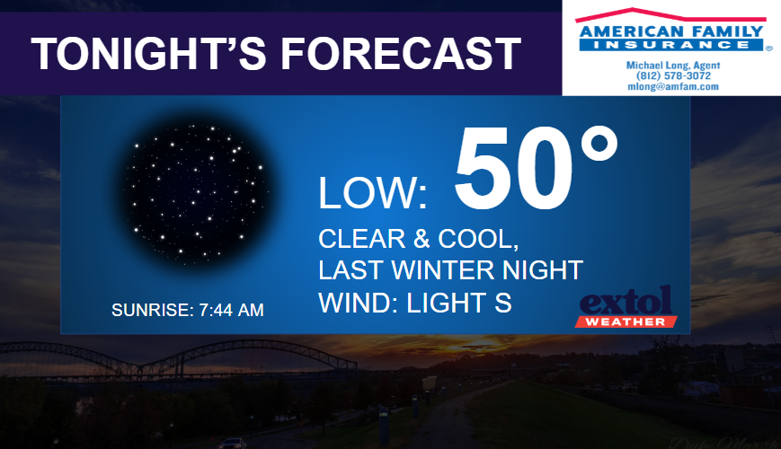 It’s going to be nice and mild for our last day of winter with highs in the 60s and a partly sunny sky. A light south breeze. We had over 18″ of snow this winter, about 6″ above normal.