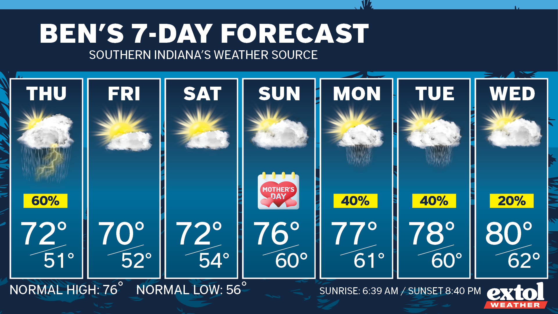 Southern Indiana will have a chance for a few sprinkles through this afternoon, but a much better chance of scattered showers and a few thunderstorms Thursday.