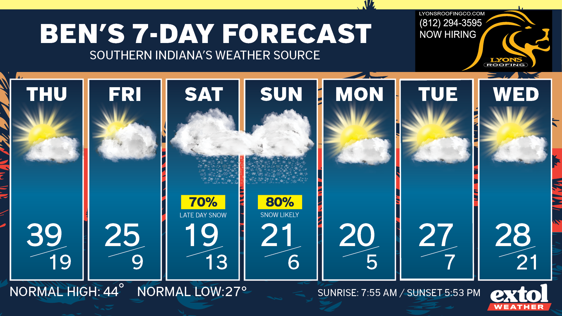 This will set the stage for a large winter storm to impact the region this weekend. Right now, it looks like it will be snowing late Saturday through Sunday. It’s too early to exactly how much snow and there will likely be a big range in amounts from north to south, with Kentucky seeing the higher totals. Along with the snow, we’ll have extremely cold temperatures.