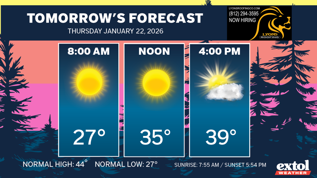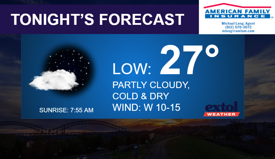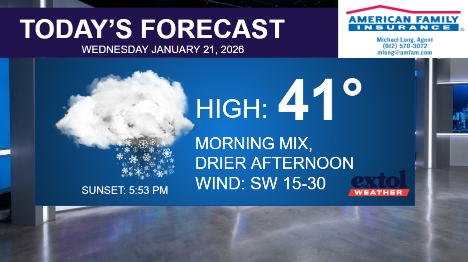 For today, we’ll be trending drier through this afternoon and a little warmer in the lower 40s. Breezy, with southwest winds at 15-30 mph. Clearing and chilly tonight.